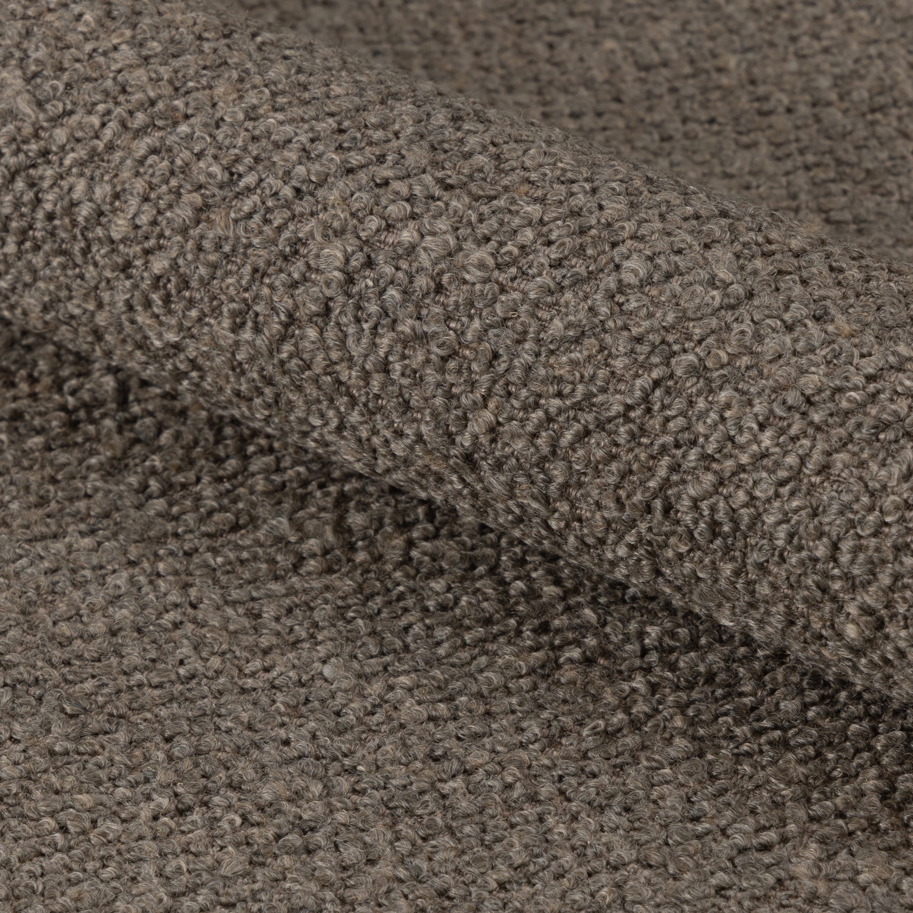 Taupe bar stool with soft bouclé fabric and tufting detail. Features a black steel trumpet base, gas lift, footrest, and swivel for a stylish kitchen addition.